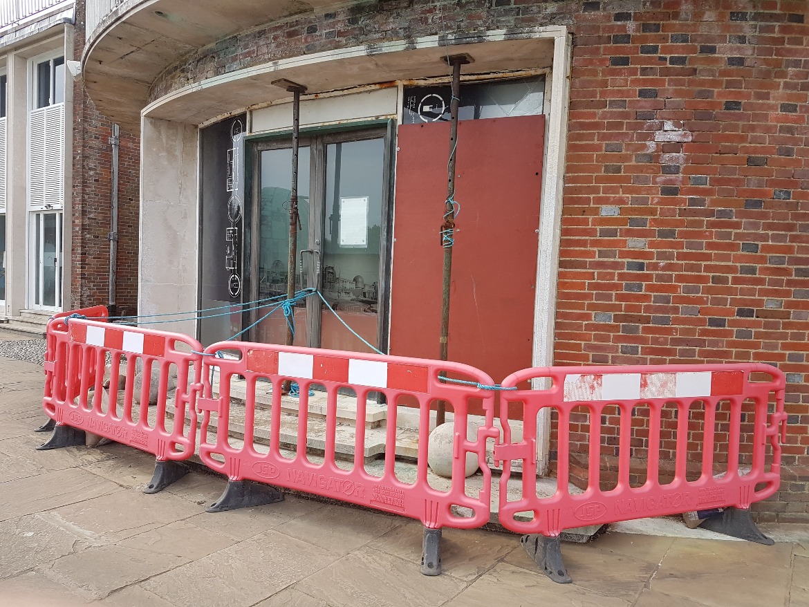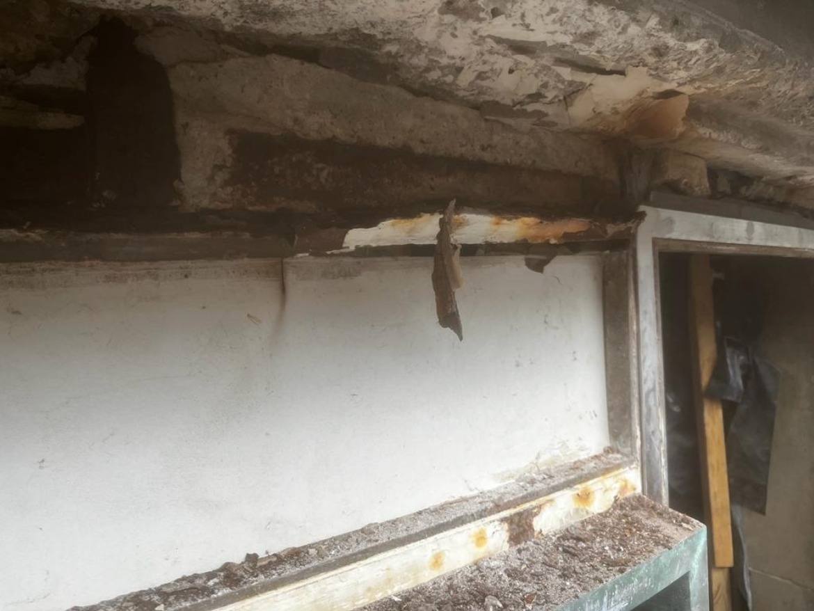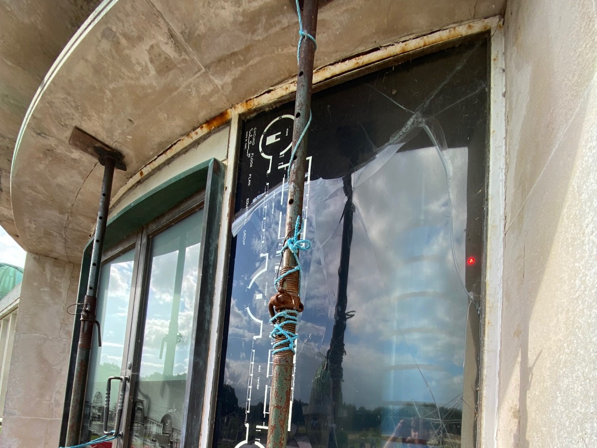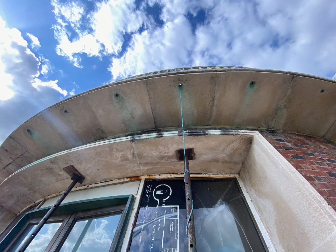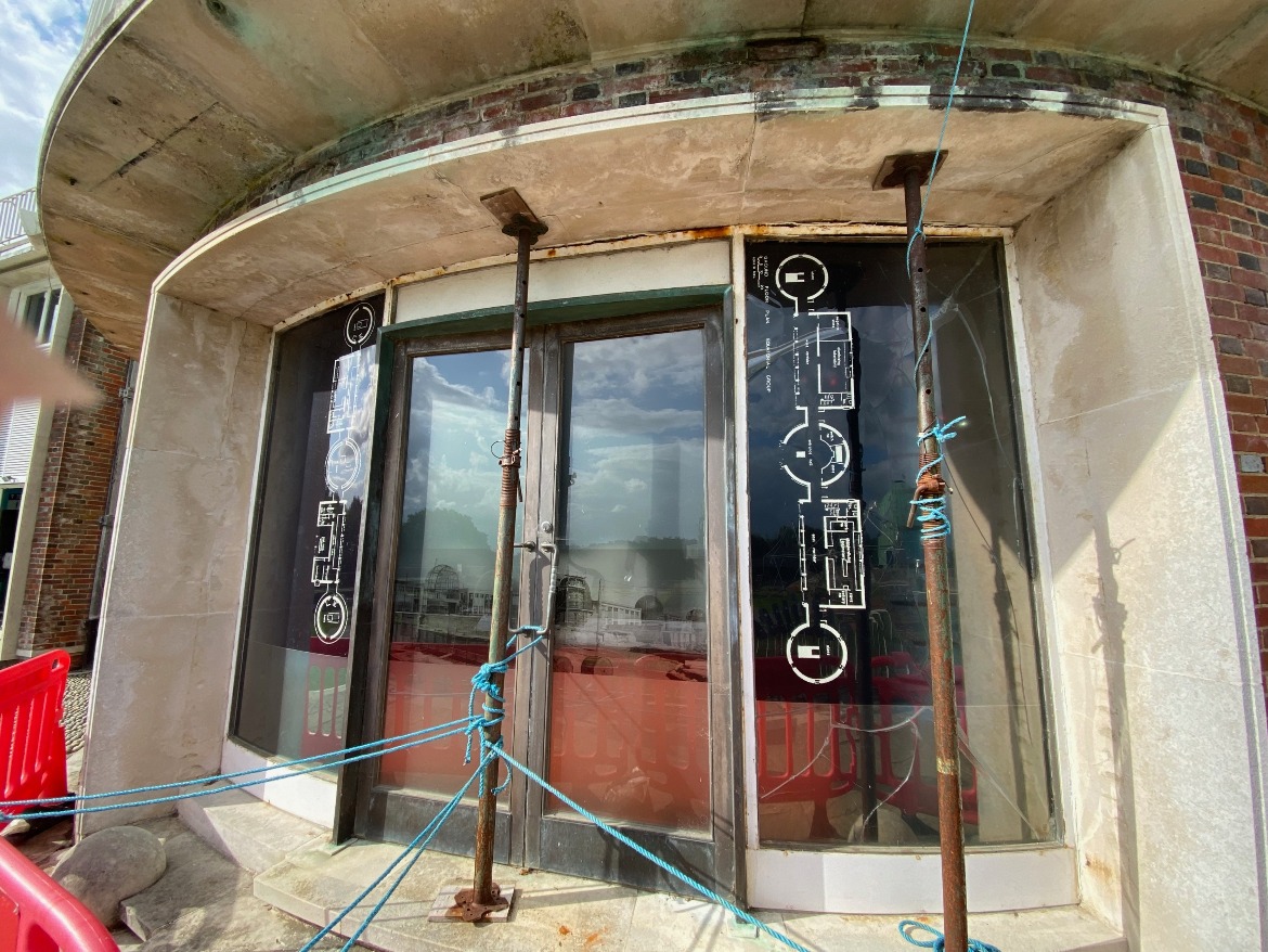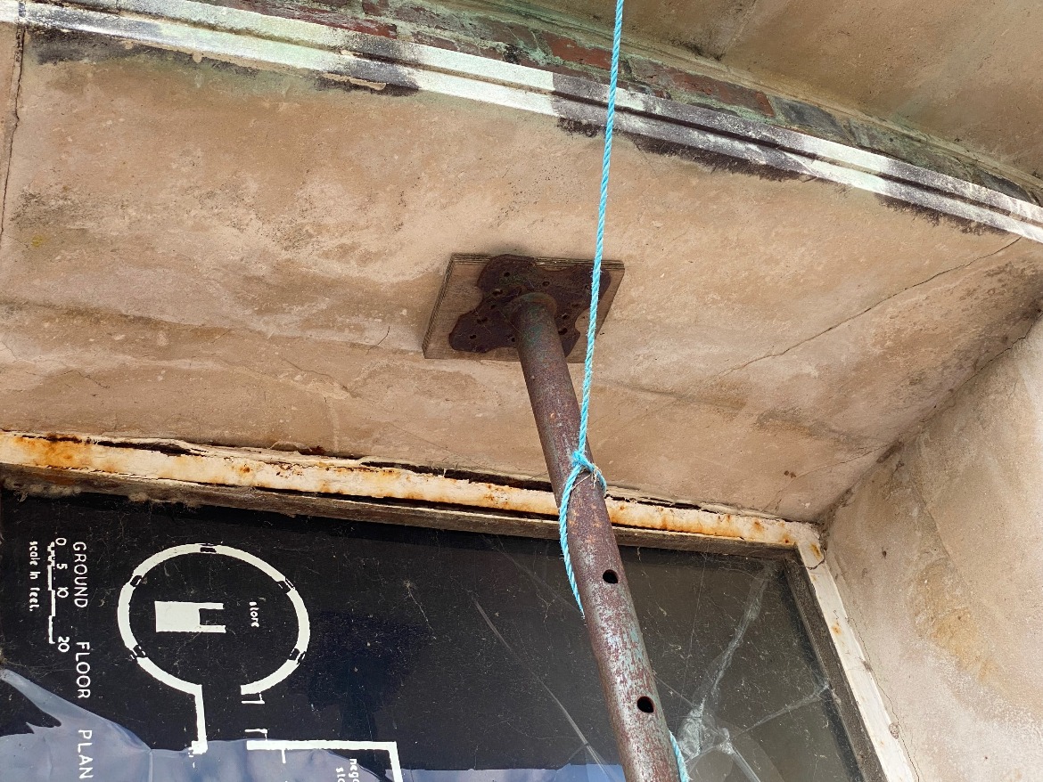 Prolonged, unobserved water ingress had resulted in extensive corrosion to the metal framework which had in turn caused one of the window panels to crack. The area was being protected by barriers and acrow props were put in place to make sure the lintel is secured. More cracks appeared in the glass so the window eventually needed boarding to keep visitors safe.