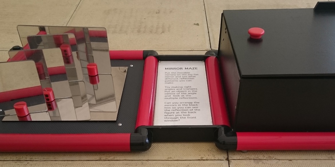 See multiple reflections by using a selection of mirrors in a partitioned box. Try to reflect the image onto the screen at the end of the maze.