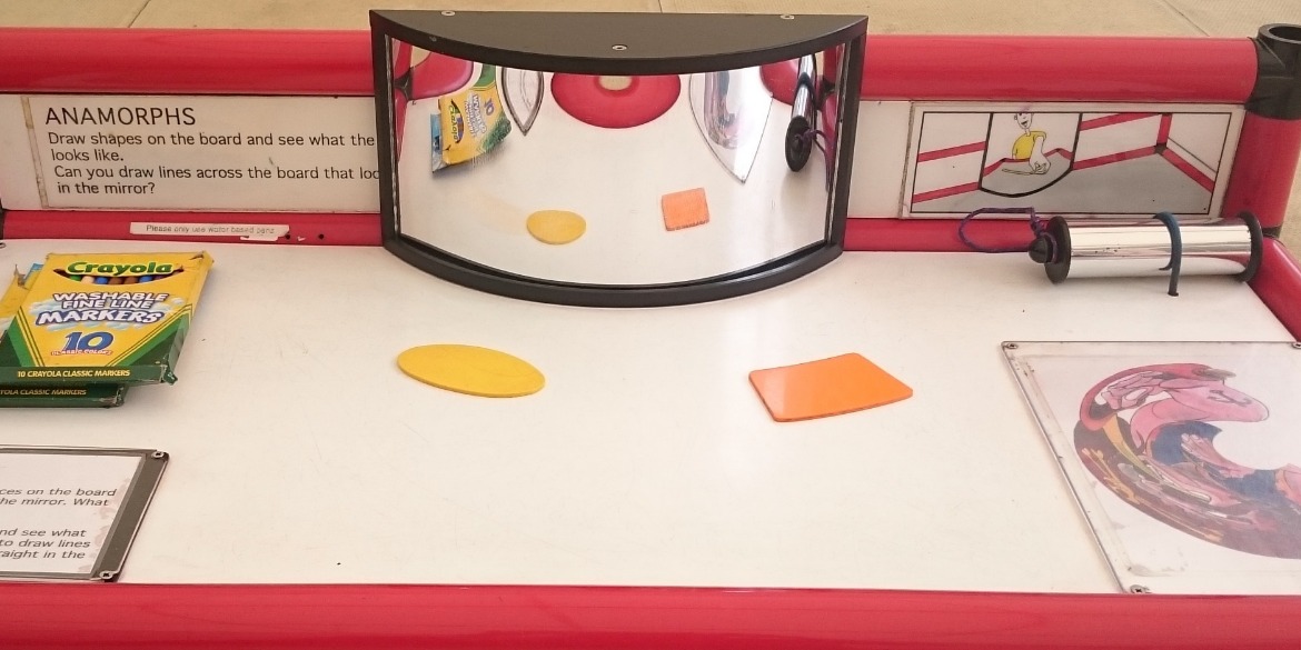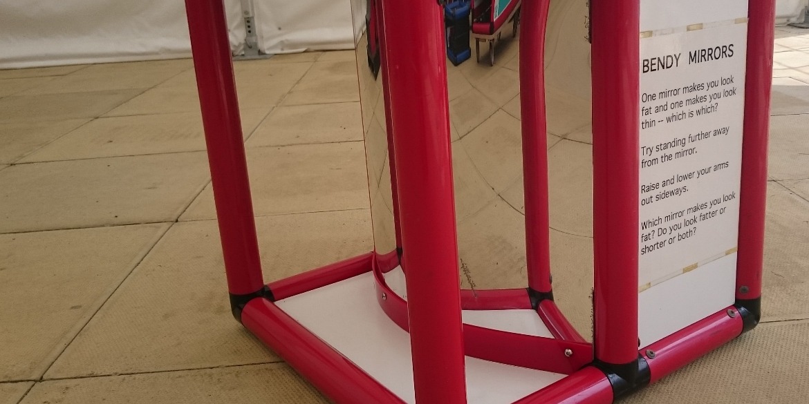 View your own distorted reflection in curved (concave and convex) mirrors.