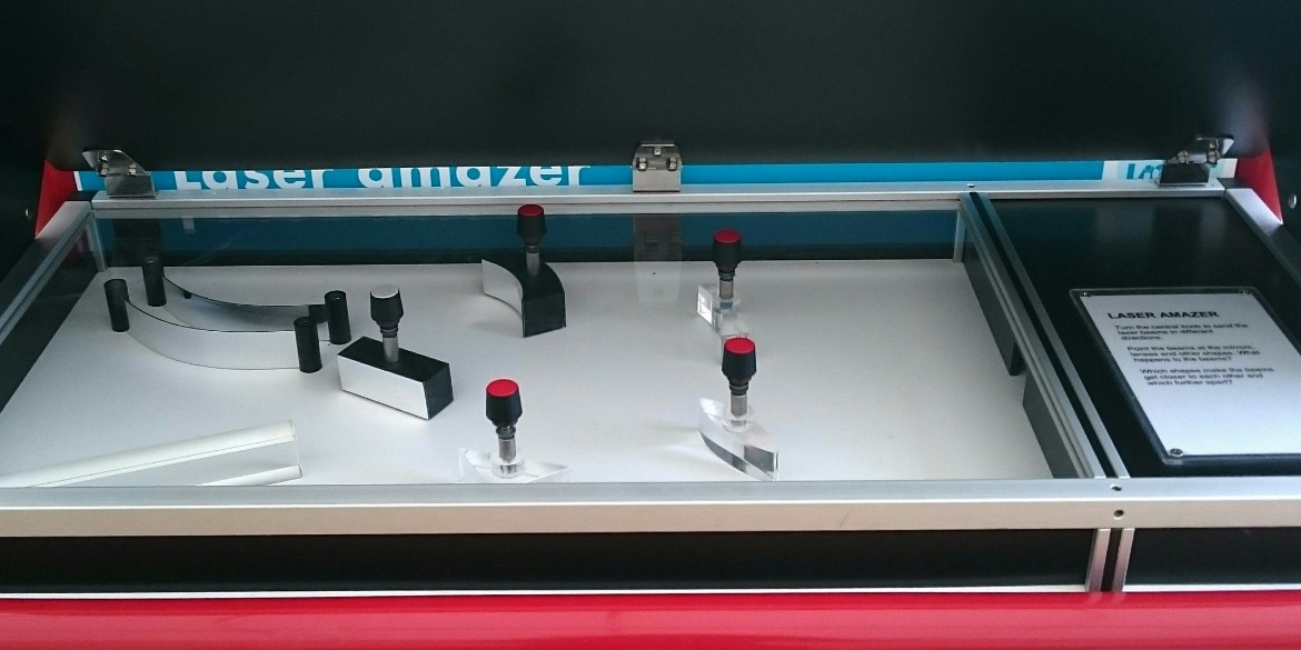 See the two lasers inside the box. Turn the lenses and mirrors to see how the lasers are bent and bounced (refracted and reflected).